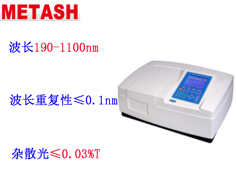 上海元析V-5100H型可見分光光度計波長范圍320-1000nm,光譜帶寬 4nm或2nm可選,雜散光≤0.1%T。V-5100H型可見分光光度計,可存儲200條標準曲線,根據編號可隨意調用;測量和存儲的數據具有斷電保持功能;波長自動校準、自動設定、偏差自我修復